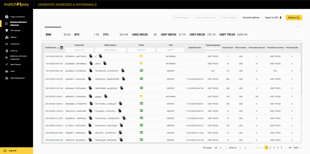 The Generated Addresses & Withdrawals tab provides an intuitive, centralized interface for managing cryptocurrency address generation and withdrawal requests. This section makes it easy for users to handle all their transactions efficiently, from generating new wallet addresses to reviewing, rejecting and confirming withdrawal requests.