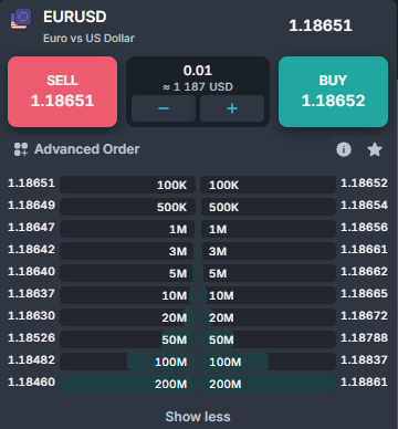In the image above, Broker can see a sample orderbook of the EURUSD instrument. He can use it to check what volume can be executed at exactly what price. If an order is bigger than 500k (5 lots), then the client will consume more than one orderbook line, and he will receive a VWAP (Volume Weighted Average Price).