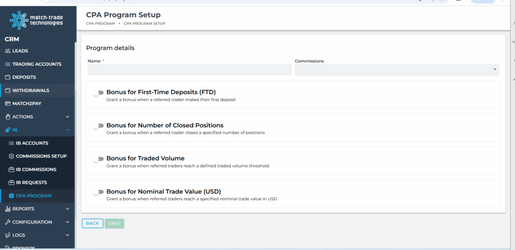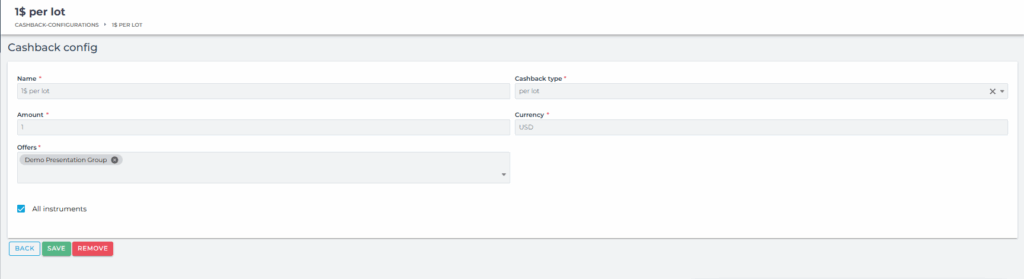 In this tab, you can configure the cashback program for your clients. The clients receive the cashback for their trades.