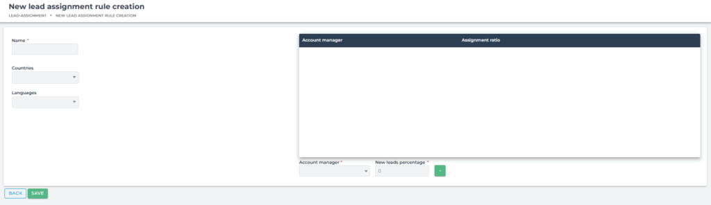 In this tab, you can add the assignment rules which will be followed, when new leads will be added into your back office.