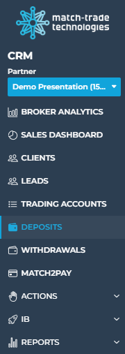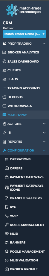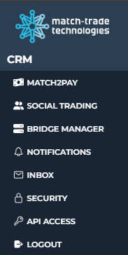 - Match2Pay – opens the Match2Pay payment processor panel, where you can: