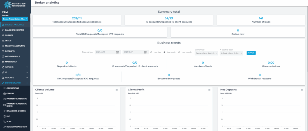 The Broker Analytics tab provides a summary of your clients’ trading activity and funding, helping you quickly assess overall performance and trends.