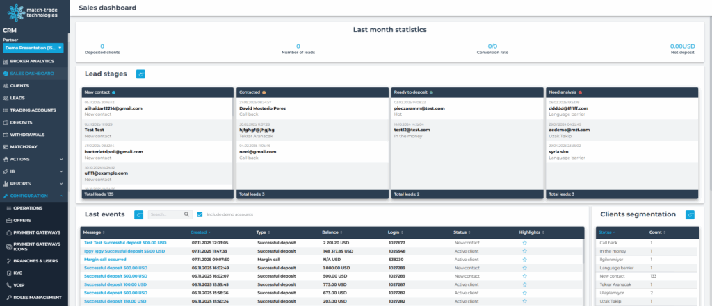 The Sales Dashboard tab gives a quick overview of your sales team’s performance and lead funnel. You can track how many new leads were acquired, how many of them made their first deposit, and how leads are distributed across different stages.