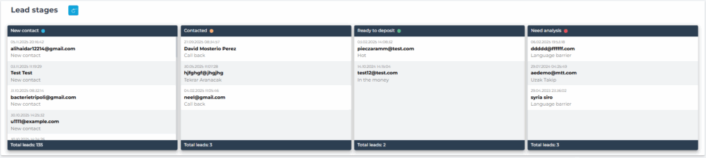 - Helps you understand where leads are concentrated in the funnel (e.g. New, Contacted, Qualified, FTD, Lost).