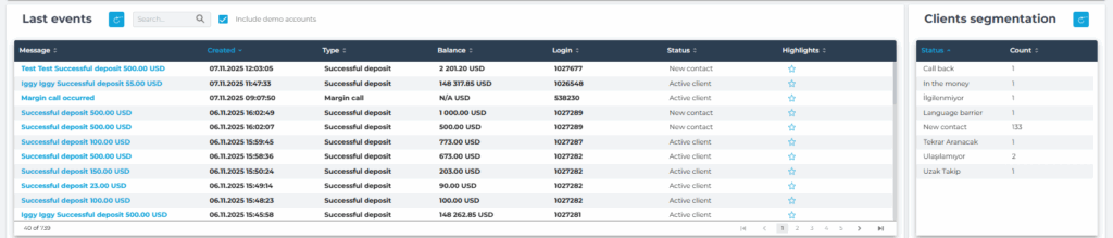 - Displays the most recent trading and payment events related to your leads and clients.