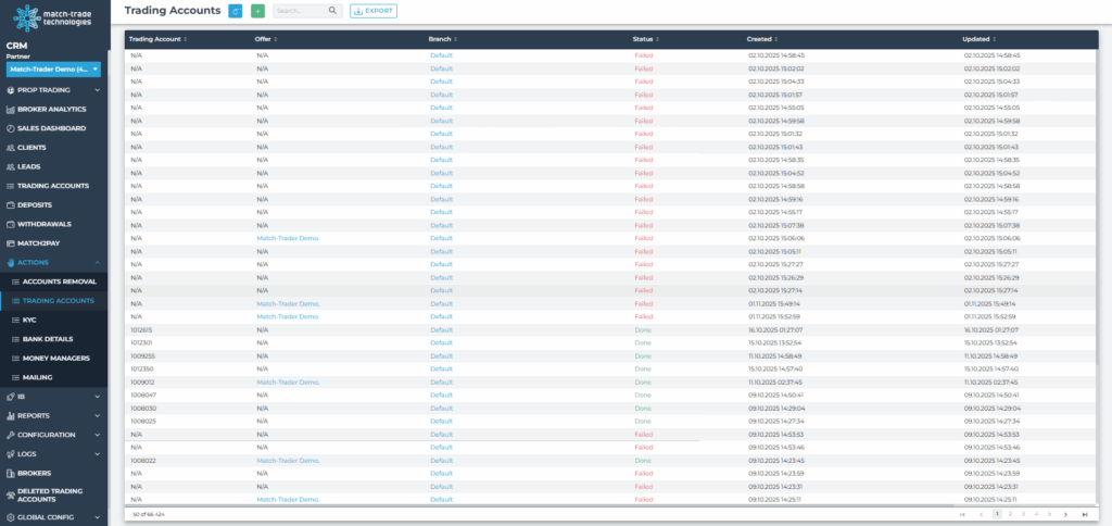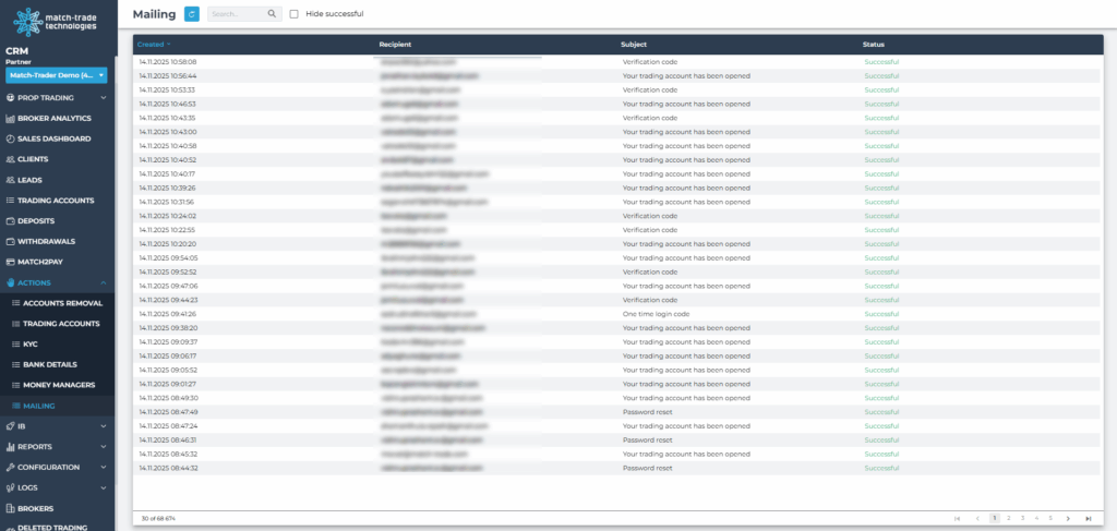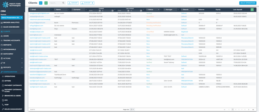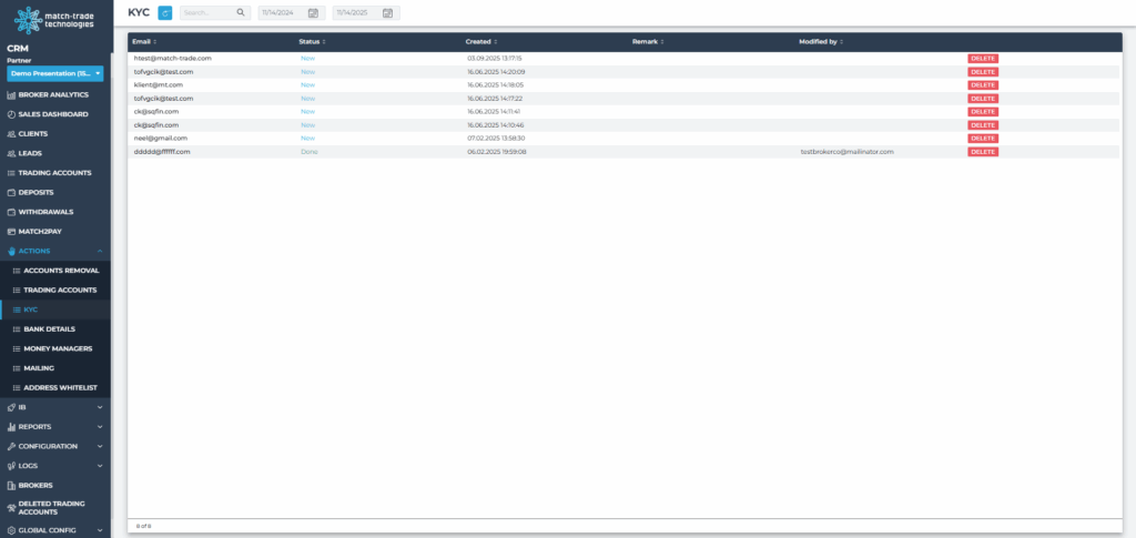 A record of automated operations executed by the CRM on client accounts – such as account creation, KYC status updates, and triggered communications. These logs help trace background processes, rule-based actions, and scheduled tasks. Each entry includes the client’s email, operation name, status, and a brief system-generated remark.