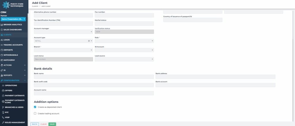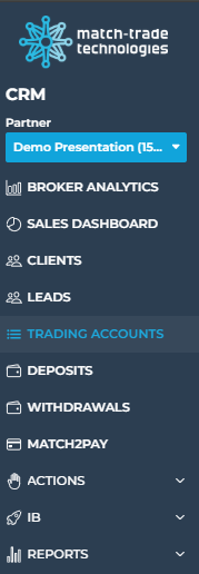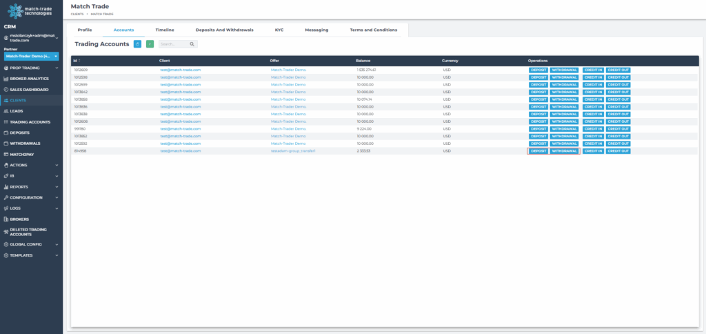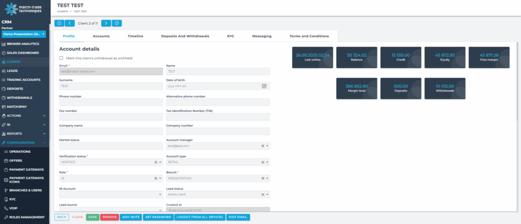 - Account details (trading accounts, roles, lead information, assigned manager, status, etc.)