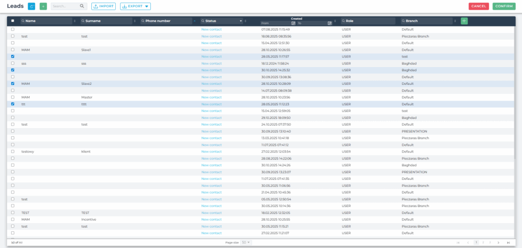 In the Clients tab, you can perform selected actions on multiple clients at once using Bulk operations. This is useful for updating lead/client attributes or communicating with a group of clients in a single step.