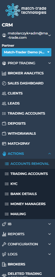 At the top bar of the Back Office, you can find shortcuts to other Match‑Trade products and to your personal account settings.