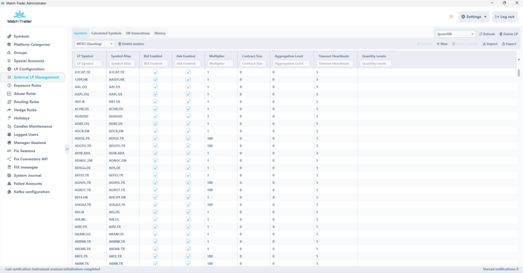 In this window broker can find all the fix application connected to the system. After selecting fix application created fix sessions will be visible with their type of connection and current status. Broker can click on the individual session and provoke the logon, logout, reset or dissconnect. At the bottom of this window are the events and messages which happend on the chosen fix session.