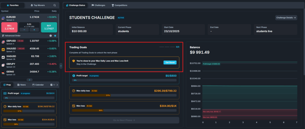 Trading goals – If the client passes all Trading Goals and won’t have any open trade, he will be able to move on to the next phase by clicking “NEXT PHASE“.